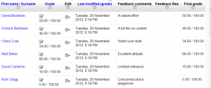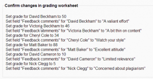 Cuando el profesor haya completado su calificación fuera-de-línea, pueden entonces subir la hoja de cálculo, confirmar los cambios y las calificaciones y comentarios serán transferidos al Libro de calificaciones de Moodle: