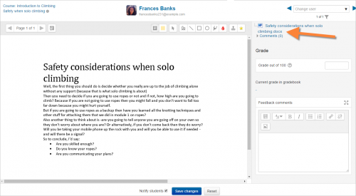 El profesor puede hacer anotaciones en archivos PDFs, docx y odt dentro de su navegador de Internet, y al guardarlo, el archivo con anotaciones se hace disponible para el estudiante. (Revise junto con su administrador que Ghostscript y un Convertidores de documento estén habilitados en caso de que Usted no pudiera hacer anotaciones en archivos subidos.) En la imagen de pantalla inferior, un archivo docx file ha sido subido y convertido, para que el profesor pueda usar las herramientas para hacerle anotaciones para comentar directamente en la tarea del estudiante: