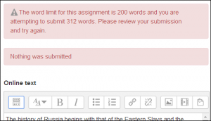 Es posible configurar un límite de palabras a una tarea de texto en-línea. Los estudiantes recibirán una advertencia si tratan de exceder el límite de palabras. Los números se cuentan como palabras y las abreviaturas (como en idioma inglés por ejemplo: I'm o they're ) se cuentan como una palabra.