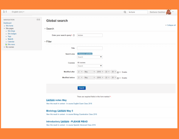 Buscar en todas partes: Si se habilita por su administrador, la característica de Búsqueda global le permite buscar cursos a los que tenga acceso, desde una caja junto al menú del usuario o desde el Bloque de búsqueda global