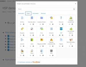 - Elija 'Añadir una actividad o recurso' para abrir el Selector de actividad. Haga doble clic para añadir una actividad o recurso; elija la "i" para obtener más información y elija el ícono de la estrella para añadirlo a una pestaña separada de "Destacados".
