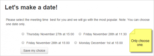 Notas del traductor: En el Español de México el módulo choice se tradujo como Módulo de elección en lugar de consulta como aparece en el Español internacional, para evitar confusiones con otros módulos (como el Bloque consulta que es opcional para Moodle 1.9).
