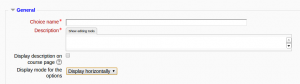 Escriba aquí la descripción de la actividad de elección. Elija "Mostrar herramientas para edición " para mostrar el editor de texto enriquecido y arrastre y suelte la esquina inferior derecha de la caja de texto para expanderla. Esta parte debe contener la pregunta que Usted quiere que respondan sus estudiantes. Un ejemplo del texto de una elección podría ser "¿Cual es su color favorito?" También hay una opción para mostrar la descripción de la elección en la página del curso, debajo del enlace hacia la actividad.