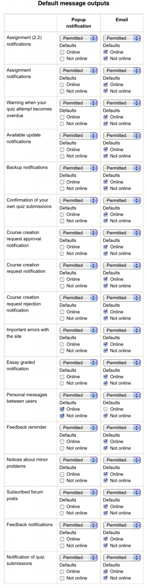 You can specify the default outputs for each type of message that Moodle can send.