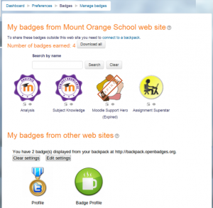 In Preferences > Badges > Backpack settings, a connection can be set up with an external backpack provider such as the Badgr backpack. Connecting to a backpack lets you display external badges on your site and push badges earned on your site to your backpack.