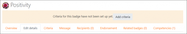 Cuando los detalles iniciales han sido añadidos y la insignia subida, el hacerle click para continuar lo conucirá a la pantalla en donde deben configuarse los criterios junto con la información adicional.