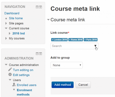• Click the dropdown menu under the enrolment methods and select 'Course meta link'.