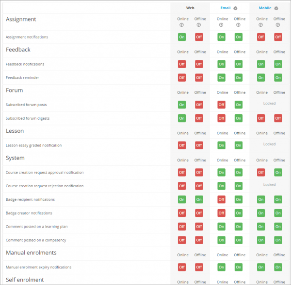 Because users might have many different messaging options, they are ordered into different components - for example, activities, system, enrolments etc.