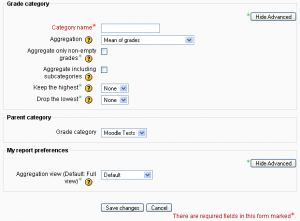 Una categoría de calificación tiene su propia calificación agregada que se calcula a partir de sus elementos de calificación. No hay límite en el nivel de anidamiento de las categorías (una categoría puede pertenecer a otra categoría). Aun así, cada elemento de calificación puede pertenecer sólo a una única categoría. Además, todos los elementos de calificación y categorías pertenecen al menos a una categoría permanente: la categoría de curso.