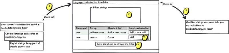 Al mostrar un texto, Moodle primeramente busca, para ver si existe una personalización local en moodledata/lang/xx_local/archivo_del_componente.php. Si así fuera, se empleará. En caso contrario, se usará el texto del paquete oficial. (Si aun no estuviera traducida la cadena de caracteres, se mostrará la versión del texto original en Inglés Australiano). Por favor tenga en cuenta que las cadenas de caracteres son cacheadas para un mejor desempeño; por lo que, si Usted modifica un archivo directamente en su paquete xx_local, entonces Usted necesitará purgar las cachés de Moodle después. Las cachés son purgadas automáticamente cuando se usa la característica de personalización del idioma.