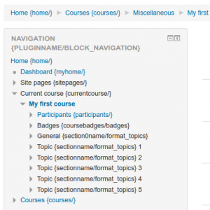 - La página será entonces mostrada con componente e identificador de la cadena entre paréntesis cursivos después de cada cadena, como por ejemplo "{nocourses/block_myoverview}". La primera parte, antes del /, es el identificador de la cadena. La última parte es el componente, como por ejemplo aquí block_myoverview.php. Si no hubiera nada después del / (ejemplo "{courses/}" ) entonces es porque la cadena está en el archivo moodle.php.