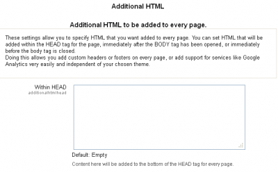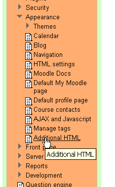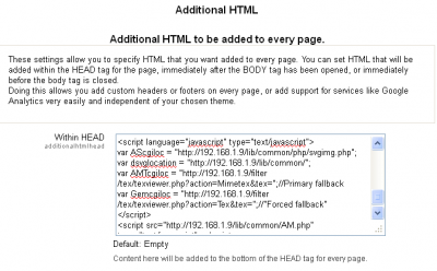 | The Additional HTML editing page is a simple and straightforward editing page. it allows you to add some additional HTML into your pages that you may feel is necessary to be consistently present right across your site. Things like logos and such are adequately catered for in temas, but there are other things that you may feel are not. Make careful consideration before you add much beyond what is required here to get the Maths tools working.