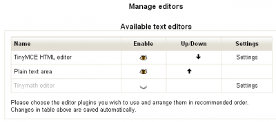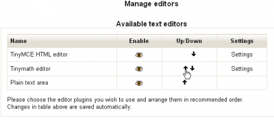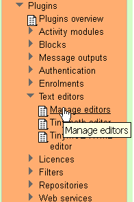 All these sub-folders can be copied to the moodle/lib folder, and if the default HTMLArea and TinyMCE editors are required to be retained, then the TinyMath editor sub-folder can be added to the moodle/lib/editor folder. You may decide to remove the original editors and replace them with the TinyMaths editor. If so, the moodle/lib/editor folder can be deleted and replaced with the plugin's editor folder. However, this is not a recommended practice. What is used in case of a back stop being required? The Admins can deactivate the defaults and activate the TinyMath editor, retaining the original default editor as an emergency back stop.