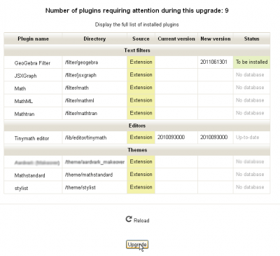 Log into the Moodle and it should open into the Site Administration > Notifications page. Usually when there has been an addition, Moodle will automagically include everything as part of its installed files listing and open the Site Administration > Notifications page. If it does not, then go to the Notifications page and it should automatically bring up what it is changing and updating.