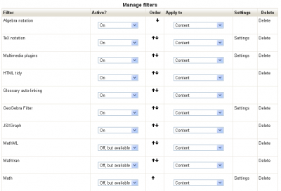 - ASSUMPTIONS: Your Moodle is using a script-to-image converter to render TeX. You have activated and configured the Filtro de notación TeX and have ensured the Algebra Filter has been activated. (As a test, you may want to edit some TeX and check that it renders properly.)