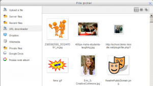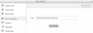 El repositorio descargador de URL le permite a los usuarios escribir la URL de una imagen (de tipo PNG o JPG) para copiarla a Moodle. También puede usarse para obtener todas las imágenes de una página web si se introduce la dirección de la página web. El soporte para tipos de archivos arbitrarios se añadirá en MDL-27336.