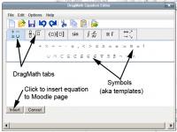 DragMath is based on the simple idea that the User who does not know a lot of TeX (pronounced Tech) can still create mathematical formula for publishing. In this case, Moodle is the dispaly agent so the TeX formulae are then rendered to a Moodle screen. This essentially means that with little experience, any Junior High Maths teacher can generate all the formulae they need for most aspects of Maths in Moodle.