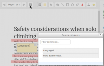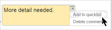 Los comentarios pueden añadirse y después guardarse en una lista rápida para uso futuro (1) Haga click en el ícono del papel/lupa a la derecha del selector de página para buscar comentarios guardados previamente (2)