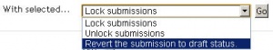 Likewise you can also revert a student's submission to draft if they have uploaded the incorrect file. Instead of selecting ‘Prevent submission changes’ select ‘Revert the submission to draft’, or place ticks against selected students and choose 'Revert the submission to draft status' from the With selected menu under the grading table.
