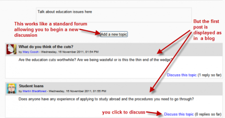 El Foro estándar mostrado en un formato similar a un blog funciona como el foro estándar para uso general, pero la primera publicación de cada discusión se muestra (como en un blog) de forma tal que los usuarios puedan leerla y después elegir responder al hacer clic en el botón para "Discutir este tópico/tema" al fondo a la derecha de la publicación.