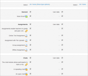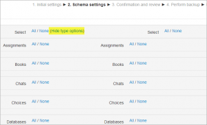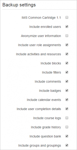 - Configuraciones iniciales - Seleccione actividades, bloques, filtros y otros ítems que requiera y después elija el botón 'Siguiente'. Los usuarios con los permisos apropiados, como los administradores y Mánager, pueden elegir si es que quieren incluir usuarios, hacer anónima la información de usuarios, o incluir asignaciones de roles de usuarios, campos de usuarios, comentarios, detalles de finalización de usuario, bitácoras del curso e historia de calificaciones en el respaldo.