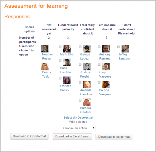 Usted, como profesor, siempre puede ver los resultados, pero a su vez puede decidir si los estudiantes podrán o no ver las elecciones de los demás y/o ver los nombres o simplemente el porcentaje de votos. Usted puede descargar las respuestas en una variedad de formatos. Las respuestas pueden ser 'publicadas', siendo visibles, por ejemplo, una vez que el estudiante haya hecho una elección o recién cuando la elección se haya cerrado. Usted puede restringir el conjunto de opciones de Elección para mostrar exclusivamente ciertas selecciones en particular y optar, incluso, por mostrar en una columna a quienes no hubieran hecho aun su elección.
