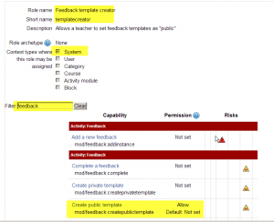 El rol de creador de plantilla puede usarse para permitirle a los profesores editores que tengan plantillas para Retroalimentación como "públicas", para usarlas en otros cursos a todo lo ancho del sitio Moodle.