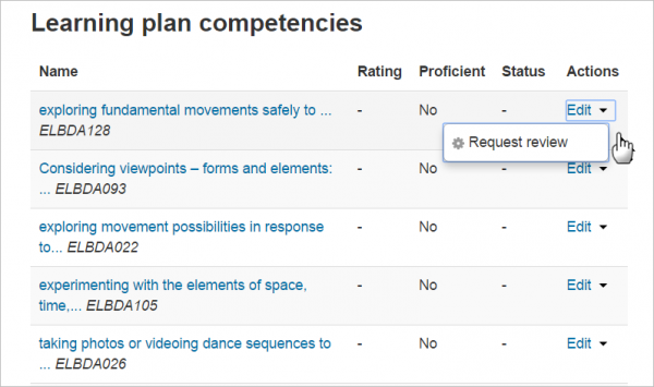 Cuando un estudiante haga click en el nombre de un plan de aprendizaje, verá las Competencias asociadas. Los estudiantes pueden ver su progreso para alcanzar la finalización y también pueden hacer click en 'Editar' para solicitar una revisión de cualquier competencia: