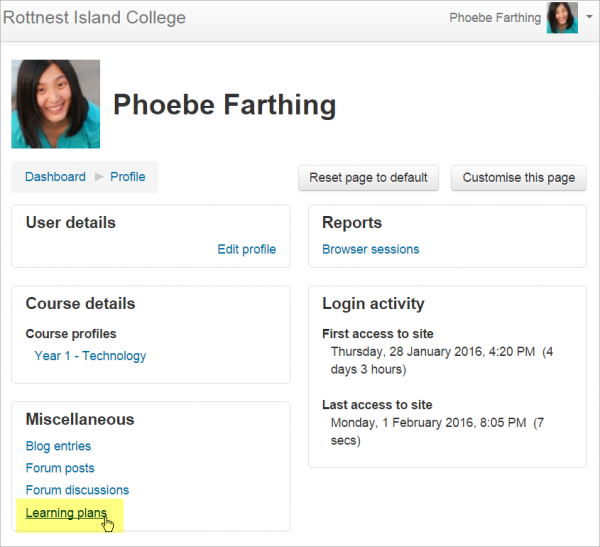 Cualquier persona puede ver sus propios planes de aprendizaje desde su página del Perfil, accediendo desde el menú del usuario: