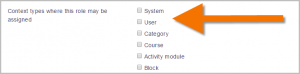 - Seleccione 'Usuario' como el tipo de contexto en donde el rol puede ser asignado. (Nota: Usted puede selccionar 'Sistema', pero esto significaría que el profesor verá todos los planes de aprendizaje de todo el sitio. Normalmente un profesor solamente revisaría los planes de sus propios estudiantes en sus cursos).