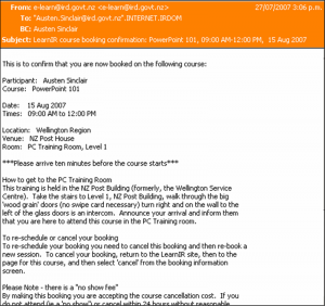 Below, they also receive an email message confirming the booking. This email message is re-sent with the header "Reminder" a settable number of days in advance of the session.