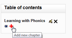 - Click on the + icon in the Table of Contents or first chapter. The new chapter will be inserted directly after the chapter whose title is on the same line as the red cross you click (Screenshot 1).