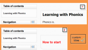 - Si usted prohíbe los títulos personalizados, el título del capítulo (el que aparece en la tabla de contenidos) aparecerá como un encabezado en la parte superior de su contenido (1 debajo). Si usted permite títulos personalizados, usted podrá crear un título diferente del que aparece en la TdeC o no mostrar ningún título en absoluto (2 debajo). Si usted habilita títulos personalizados, usted necesitará editar el título del capítulo como parte del contenido de la página.