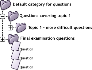 - Consejo: Es una buena práctica crear categorías y subcategorías de preguntas. Esto es mejor que mantener todas sus preguntas en una gran lista en el módulo del examen. La característica de jerarquía le permite separar categorías en subcategorías y las subcategorías en sub-sub-categorías, etc. de forma indefinida. Las categorías y subcategorías, etc., son muy poderosas cuando se combinan con preguntas aleatorias que se pueden seleccionar de una categoría, o de una categoría o cualquiera de sus subcategorías.