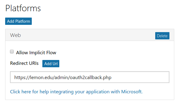 Des-seleccione la casilla de "Permitir Flujo Implícito (Allow Implicit Flow)" y configure la 'callback URL'. La 'callback URL' debería de apuntar hacia "la URL de su sitio Moodle + /admin/oauth2callback.php". Si su sitio Moodle estaba disponible en https://lemon.edu/ la 'callback URL' sería https://lemon.edu/admin/oauth2callback.php. Es importante que su sitio Moodle use HTTPS y no HTTP. Microsoft no permitirá la 'callback url' si no estuviera usando HTTPS.