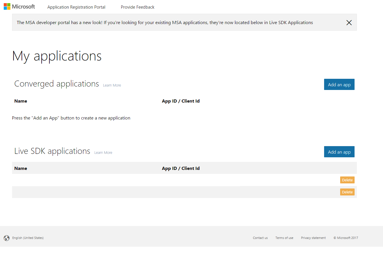 Nota: Si Usted previamente había registrado Aplicaciones con una API más antigua, su consola de Aplicación pdría verse diferente. en este caso Usted debería de crear una nueva "Aplicación Convergida (Converged Application)".
