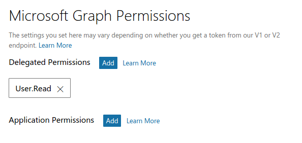 Asegúrese de que la sección de "Microsoft Graph Permissions" contenga el permiso "User.Read" .