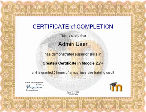 Tambien creamos una nueva cadena de caracteres llamada certifymoodle. En el archivo /certifcate/lang/en/certificate.php copiamos la línea de la cadena de texto $string['certify'] = 'Esto es para certificar que (This is to certify that)';, la pegamos debajo de la línea original y la cambiamos para que se leyera $string['certifymoodle'] = 'Esto hace constar que (This is to say that)'; Vea la sección inferior para más ejemplos acerca de como cambiar el texto.