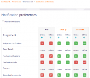 Usted también recibirá notificaciones sobre mensajes, publicaciones en foro, tareas enviadas, etc (conocidas como 'notificaciones push') si su administrador del sitio las ha habilitado. Para recibir estas notificaciones, Usted necesita habilitarlas, YA SEA vía la App O vía el sitio web.