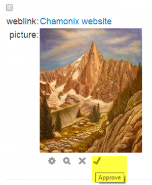 Si, durante la configuración de la BasedeDatos, se configuró 'Aprobación requerida' a 'Si' , entonces un profesor puede aprobar una entrada al hacer click en el ícono de la casilla de selección.