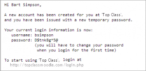 Moodle generará una contraseña temporal y le mandará un Email al usuario con instrucciones acerca de cómo ingresar al sitio y cambiar la contraseña. El mensaje de Email (como se ve en la imagen de pantalla inferior) puede cambiarse en Administración del sitio > Administración > Idioma > Personalización del idioma. Seleccionar 'moodle.php' y el identificador de cadena newusernewpasswordtext