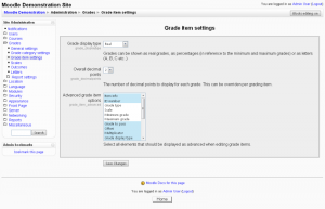 Versiones anteriores a la 2.6 de Moodle contenían una lista de varios campos que podían alternarse entre activado y desactivado para que aparecieran o se ocultara en la pantalla de ítem de calificación por defecto. Al seleccionar un campo, se pone en el menú de ítems "Avanzados" y un campo que no fuera seleccionado aparecerá en el menú principal de ítems de calificación. por defecto. Tome nota de que todas estas opciones siempre estarán disponibles para los profesores cuando elijan el botón para "Mostrar avanzadas".