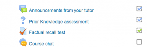 Si la Finalización de actividad es habilitada por un administrador y en las configuraciones del curso, los profesores pueden indicar para cada ítem del curso como es que desean que se registre cuando esté completo. Aparcerá una casilla de verificación contra de la actividad. Los estudiantes pueden, una de dos, marcarla manualmente como completada, o el ítem puede ser registrado automáticamente una vez que el estudiante satizfaga los criterios especificados. estos pueden ser: ver un Recurso, enviar una Tarea, publicar en un foro u otras condiciones. El profesor puede ver una vista general de quien ha completado que en el reporte de finalización de la actividad en Administración del curso > Reportes > Finalización de actividad .
