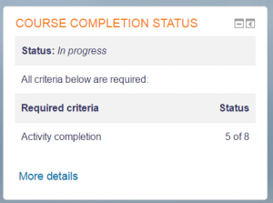 Como una extensión de la finalización de actividad, el habilitar la Finalización del curso permite que un curso sea marcado oficialmente como terminado, ya sea manualmente o auotomáticamente de acuerdo a criterios especificados. Si el Bloque de estatus de finalización del curso fue añadido, los estudiantes pueden ver su progreso durante el curso. Los profesores pueden ver el progreso general de los estudiantes para obtener la finalización del curso desde Administración del curso > Reportes > Finalización del curso .