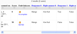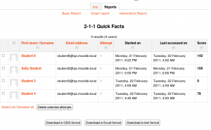 El reporte de interacciones puede descragarse en formatos de ODS, Excel o formato de texto, y puede incluir respuestas, respuestas correctas y (nuevo en 3.1) resultados (si es que la respuesta a una pregunta era correcta o incorrecta).