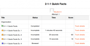 A detailed report of each user's attempts may be obtained by clicking on the number in the attempts column. The track details link provides information on specific SCORM values recorded in Moodle by the SCORM object.