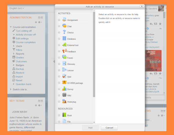 Cuando se activa la edición, el Selector de actividad de Moodle ofrece Recursos y Actividades para que seleccione el profesor. Al hacer click sobre de un botón se muestra información acerca de las características de cualquier actividad particular, para que Usted pueda ver si cumple sus necesidades. Para más detalles, vea el screencast en idioma inglés Activity chooser.