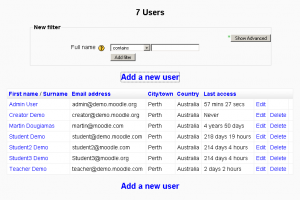 Después de aplicar un filtro a una búsqueda de usuario, elija el botón para 'Añadir filtro' para realizar la búsqueda de usuario. Todos los filtros aplicados a la búsqueda están enlistados arriba de los resultados de la búsqueda. Usted puede añadir o remover (usando las casillas correspondientes) Filtros a su criterio de búsqueda según lo requiera. Estos filtros son guardados dentro de una sesión de Moodle.