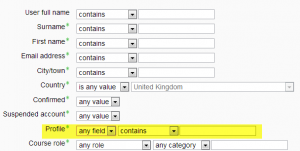 El elegir el enlace para 'Ver más' le proporcionará a usted filtros de búsqueda y límites para datos adicionales. Los filtros debajo del área avanzada también incluirán a cualquier campo de perfil de usuario personalizado que hubiera sido creado dentro de su instalación Moodle.
