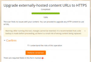 La herramienta para conversión a HTTPS convertirá cualquier contenido HTTP incrustado (no enlaces)en su sitio a HTTPS, para que se muestre correctamente en su sitio HTTPS. Es accesada desde la pantalla de seguridad HTTP en la Administración del sitio, o al escribir directamente SUSITIOMOODLE.com/admin/tool/httpsreplace/index.php (donde SUSITIOMOODLE.com es el nombre de su sitio).